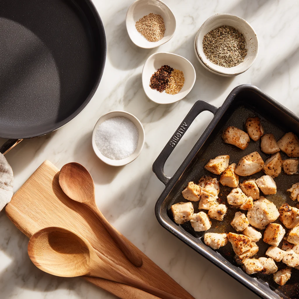 Grab a large skillet and heat up the olive oil over medium heat. Add your chopped chicken (breasts or thighs both work here — I personally love using thighs for that extra juicy texture), and sear them for 3 to 4 minutes, just until they get a bit of golden color on the outside. You’re not cooking them all the way through here — they’ll finish baking in the oven. Once seared, remove the chicken and set it aside.