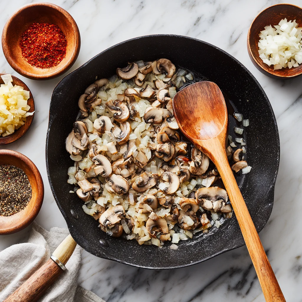 In that same skillet, toss in the chopped onion and sliced mushrooms. Let them cook down for about 5 to 6 minutes until everything softens and starts to turn golden and caramelized. This is where a lot of that savory depth of flavor builds. Add the minced garlic and cook for another minute, just until fragrant.