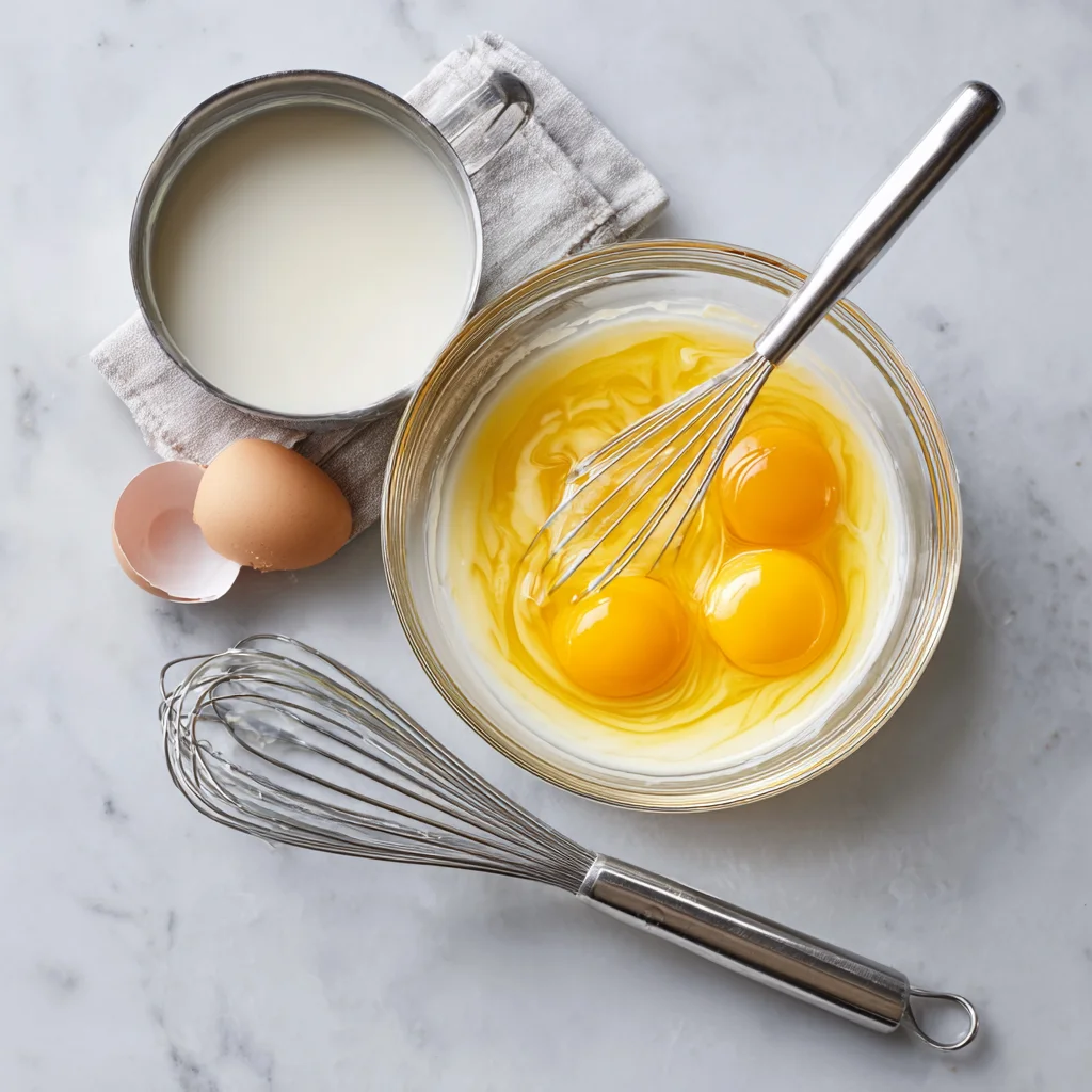 2️⃣ In a mixing bowl, whisk together egg yolks and sugar until pale and slightly thickened. Gradually pour the warm milk into the yolks, whisking constantly to temper the eggs.