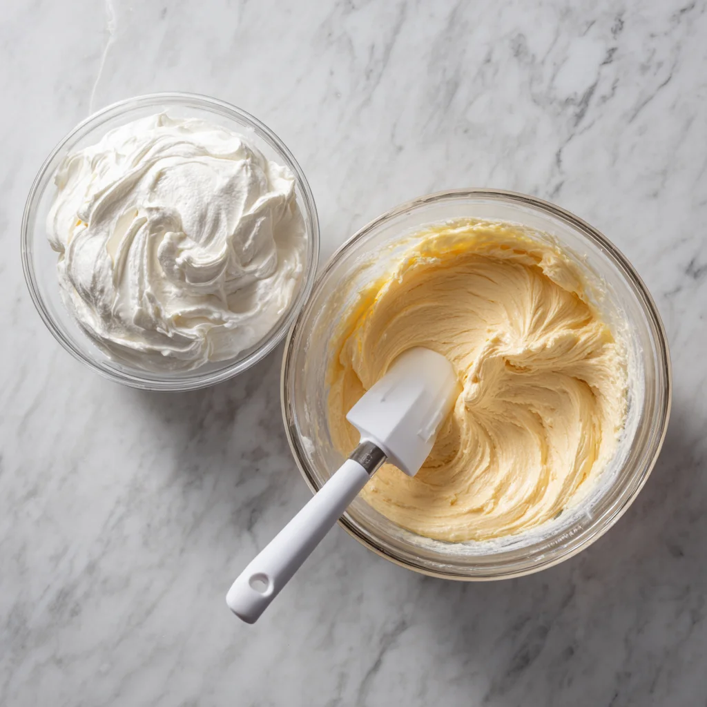 Once your custard is at room temperature and the whipped cream is ready, it’s time to fold them together. Start by adding a small portion (about a quarter of the whipped cream) into the custard to lighten it. Stir this in gently — this first addition doesn’t need to be perfectly folded.
