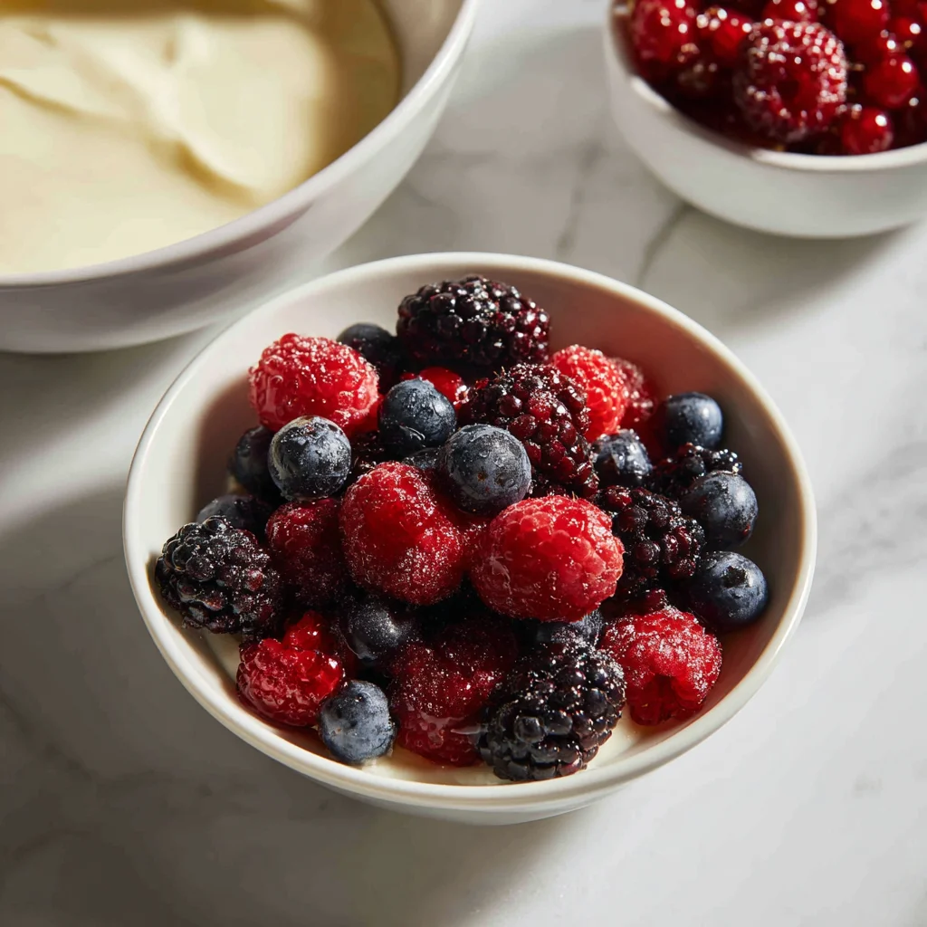 7️⃣ While the cream chills, prepare the berry topping. Toss the berries with sugar and lemon juice if desired. Let sit for 10 to 15 minutes until juices form.