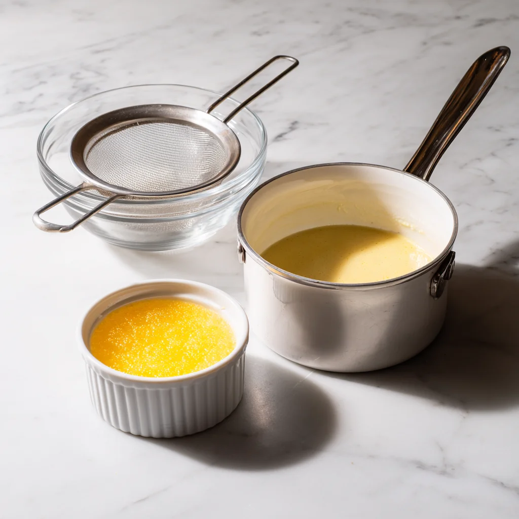 4️⃣ In a small bowl, sprinkle the gelatin over cold water and let it bloom for 5 minutes. Stir the softened gelatin into the warm custard until fully dissolved. Strain the mixture through a fine mesh sieve into a clean bowl and let it cool to room temperature.
