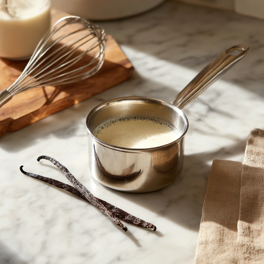 1️⃣ In a small saucepan, heat the milk with the vanilla bean (split and seeds scraped) or vanilla extract over medium heat until just steaming. Do not boil. Remove from heat and let it infuse for 10 minutes.