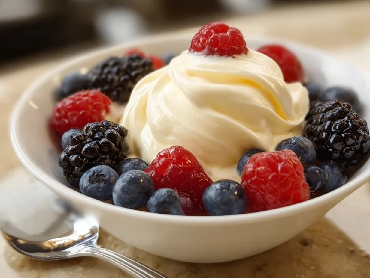 8️⃣ Before serving, spoon the berries over the chilled Bavarian cream. Serve immediately.