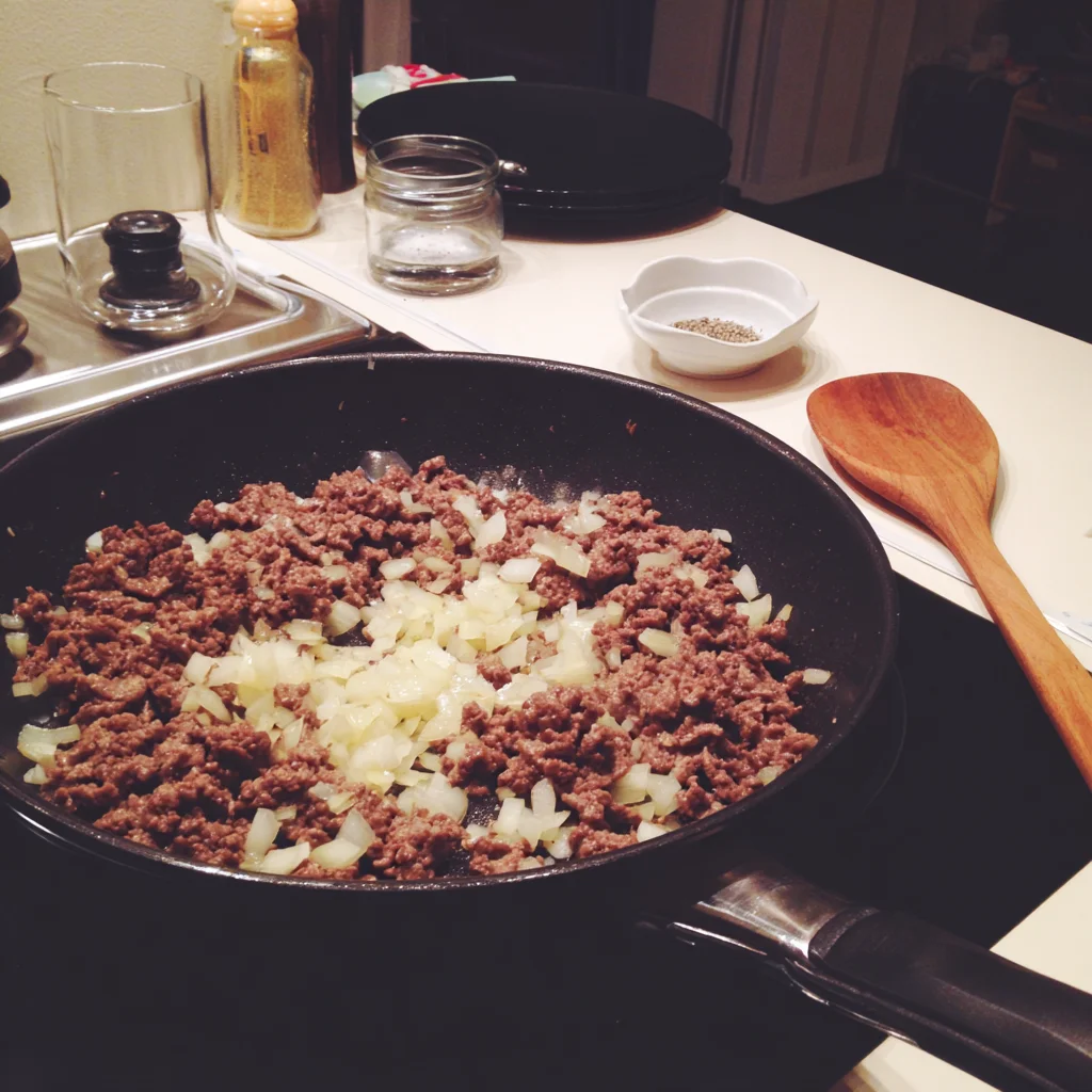 In a large skillet over medium heat, cook the ground beef until browned, breaking it apart with a spoon as it cooks. Drain excess grease if needed, then add the chopped onion and garlic. Cook for about 3 to 4 minutes until the onion is soft and fragrant.