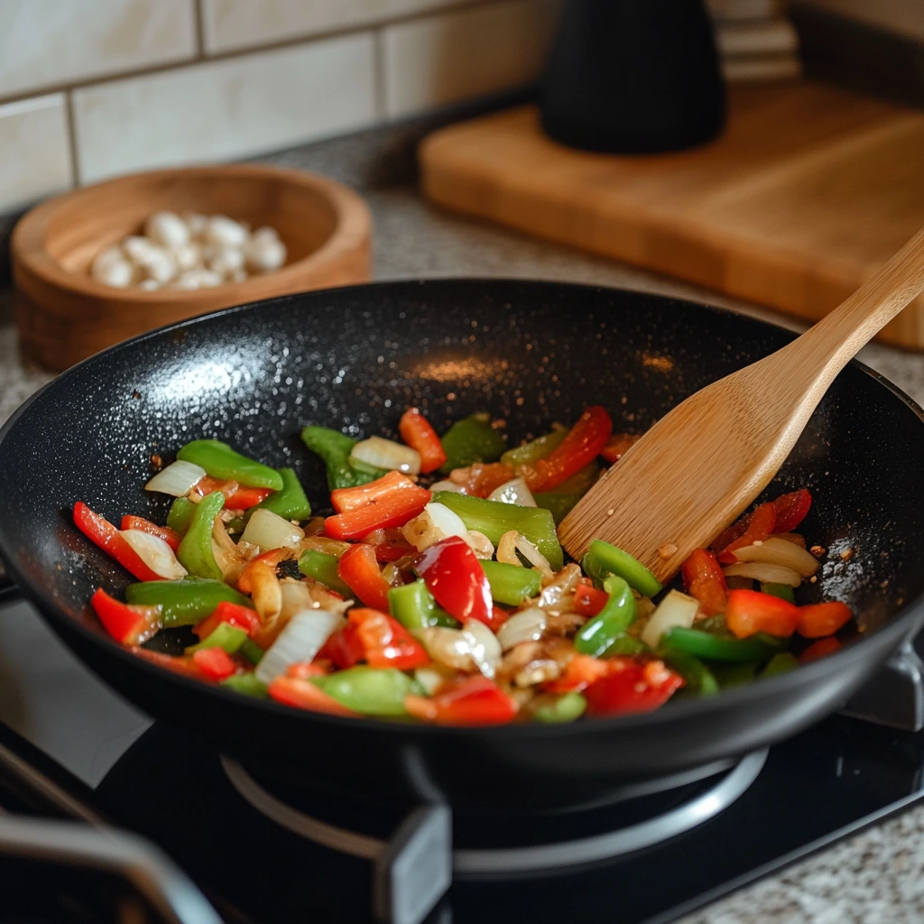 A good stir-fry is all about the right balance of heat and timing. Heat 1 tablespoon of vegetable oil in a large skillet or wok over medium-high heat. Once the oil is hot, add the sliced onion and bell peppers. Stir-fry for 3–4 minutes, just until they start to soften but still have a slight crunch.