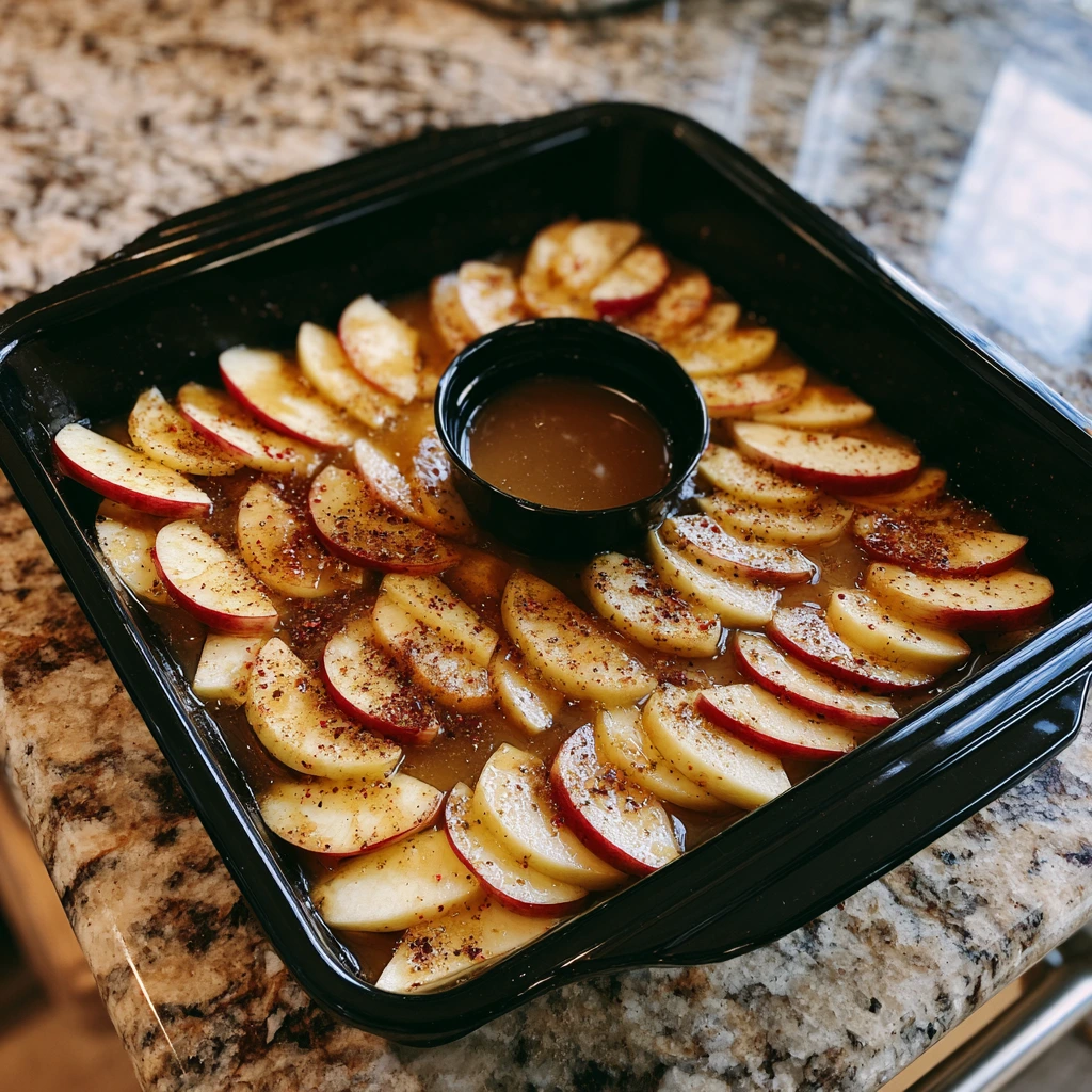 Now comes the fun part: drizzle the ½ cup of caramel sauce right over the top. Don’t worry about being precise here — those sweet rivers of caramel will bubble up and blend perfectly with the apples as they bake.