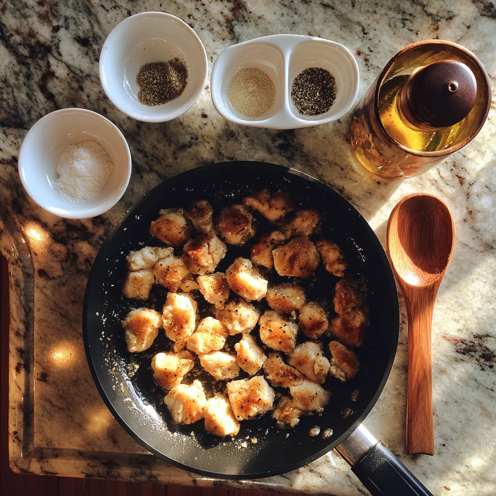 Once your chicken is done (you’ll know it’s ready when the pieces are no longer pink inside and have that perfect golden sear), remove it from the skillet and set it aside. Don’t worry about the bits left in the pan—they’ll help flavor the veggies in the next step.