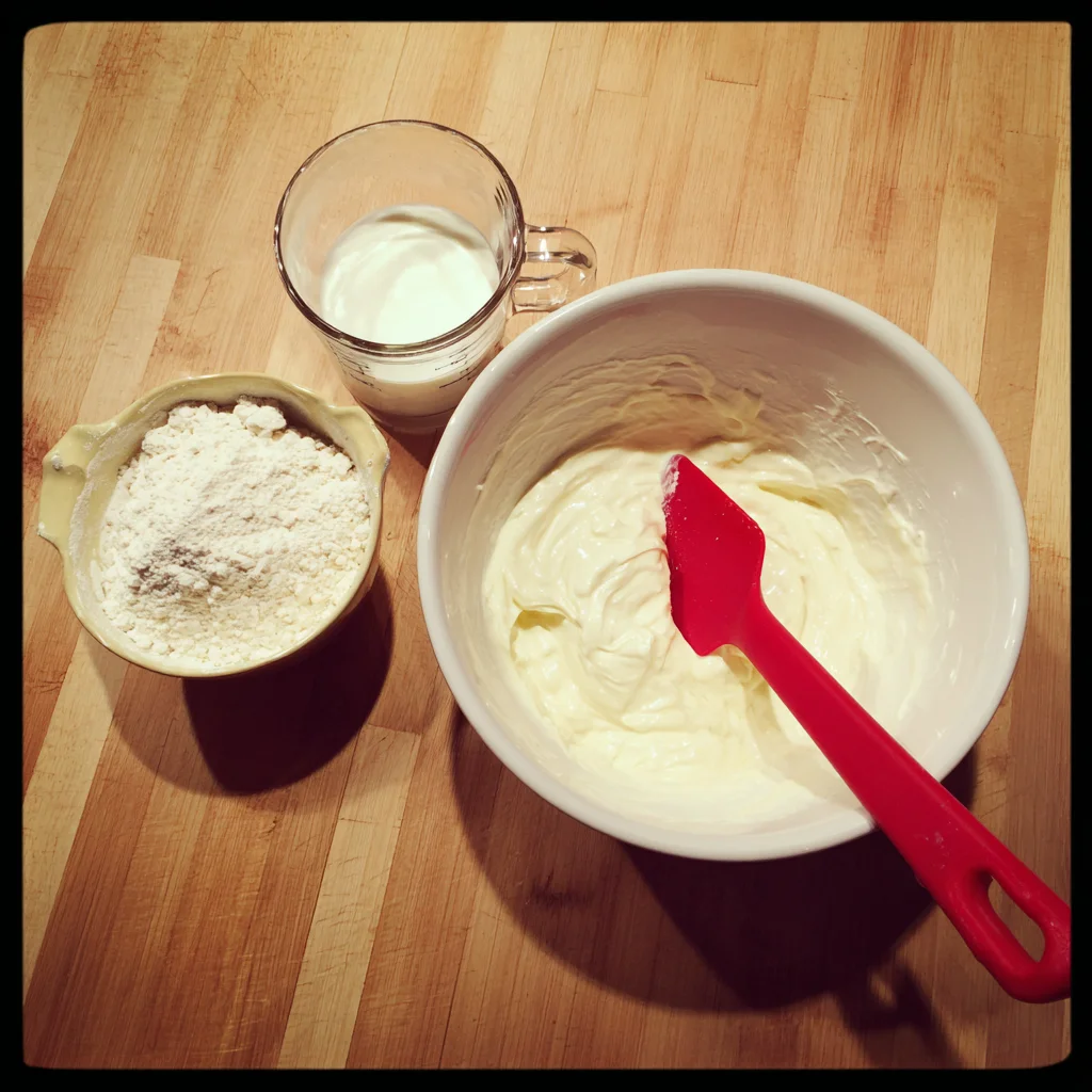 Mix in the sour cream until well incorporated. Alternate adding the dry ingredients and the milk to the wet mixture, starting and ending with the dry ingredients. Mix just until combined.
