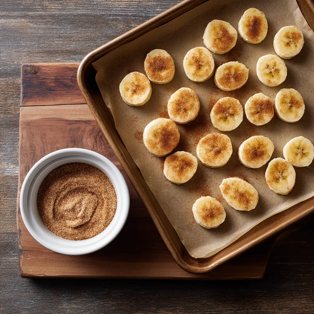 Now that you’ve prepped your bananas and arranged them neatly on your baking sheet, it’s time to move on to the part that really brings everything together—the cinnamon sugar magic and baking process. This is where those humble banana slices transform into crispy, golden chips that you’ll want to snack on all day long.