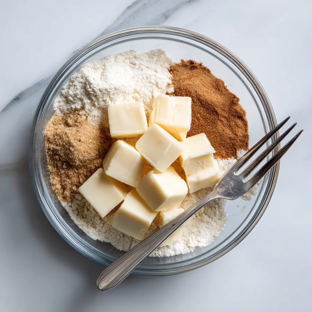 In a small bowl, combine the flour, brown sugar, and cinnamon. Then, using your fingers or a fork, cut in the cold, cubed butter until the mixture turns into coarse crumbs. You’re looking for a slightly sandy texture with small bits of butter still visible. This streusel will give that classic coffee cake crumble on top of each cookie—and it’s honestly my favorite part.