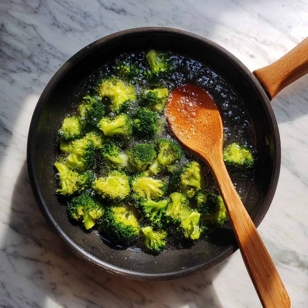 In the same skillet, add the broccoli florets along with just a splash of water – enough to help steam them. Cover the skillet with a lid and let the broccoli steam for about 2 to 3 minutes, until it’s starting to soften but still has a bit of crunch.