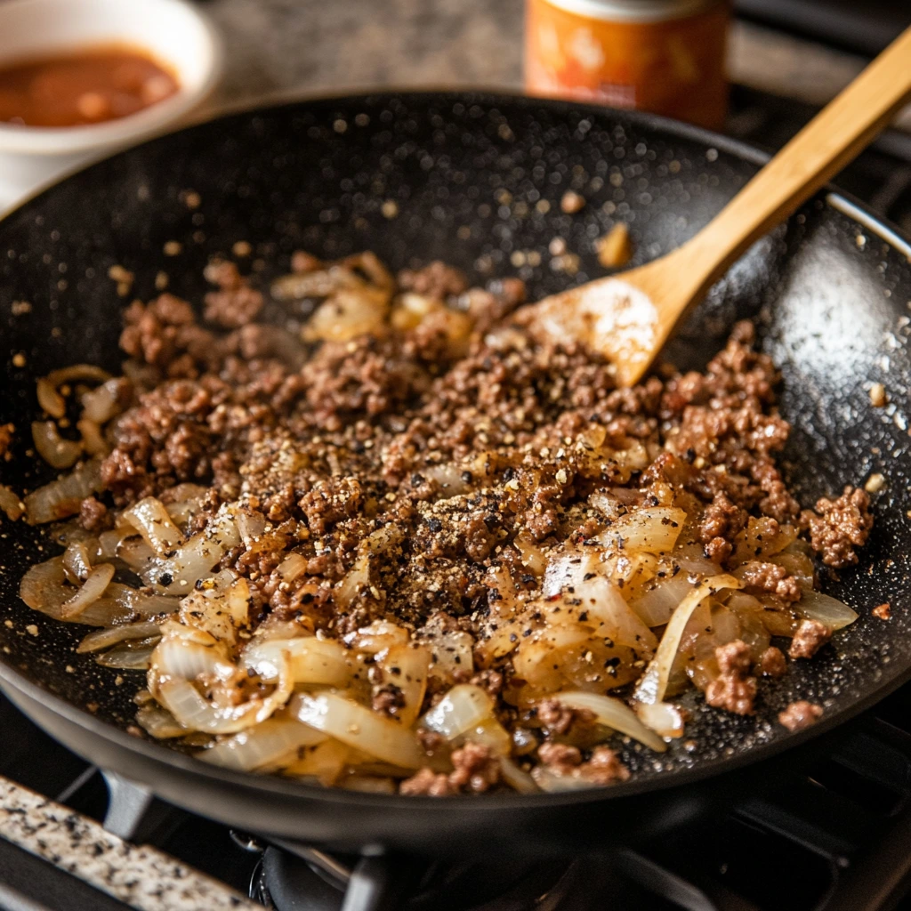 🔹 Add the ground beef, breaking it up with a spoon. Cook until browned, about 5–7 minutes. Drain excess fat if needed.