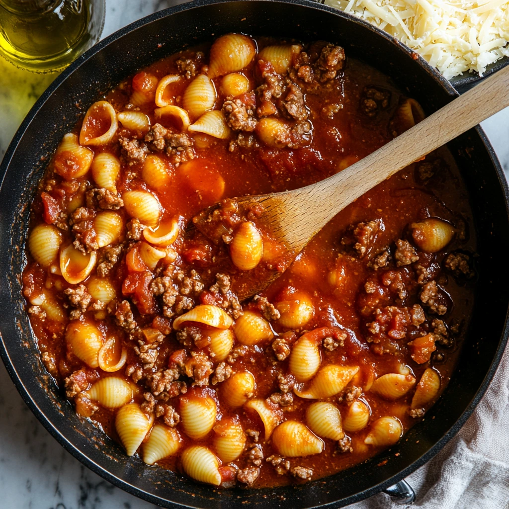 By this point, your kitchen should smell amazing—savory beef, onions, and garlic create an irresistible base for this dish. Now, it’s time to bring everything together with the pasta and sauce.