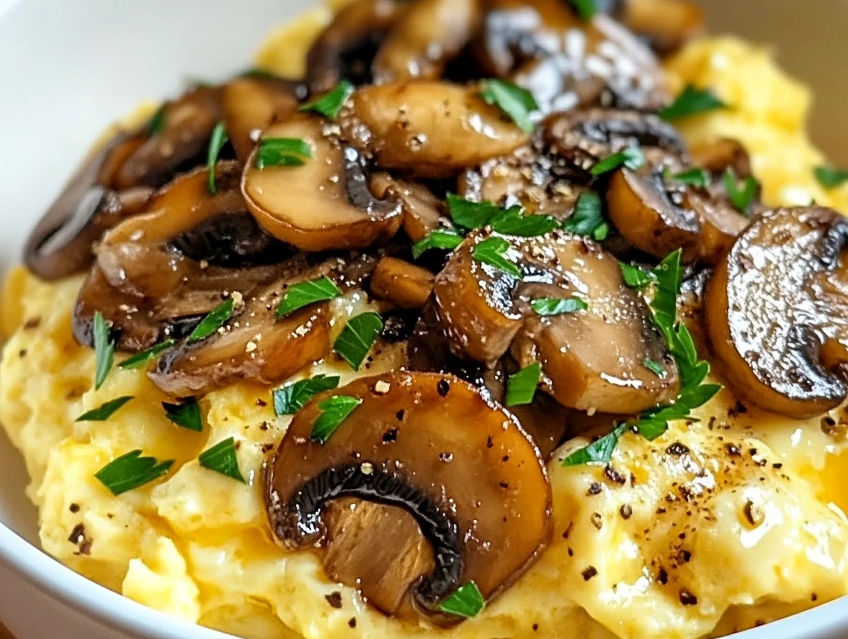 This creamy and flavorful scrambled eggs dish features sautéed mushrooms and optional cheese for a delicious, protein-packed breakfast.