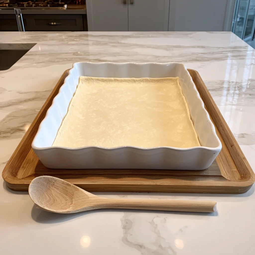 3 Unroll one can of crescent dough and press it into the bottom of the prepared baking dish, sealing any seams to form an even layer.