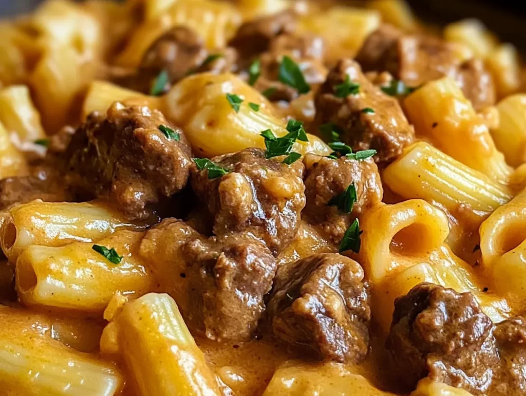 This Slow Cooker Creamy Garlic Beef Pasta recipe features a selection of ingredients that each play an essential role in creating a rich, satisfying dish with minimal effort. Here’s a closer look at the key ingredients and how they contribute to the flavor and texture of the meal.