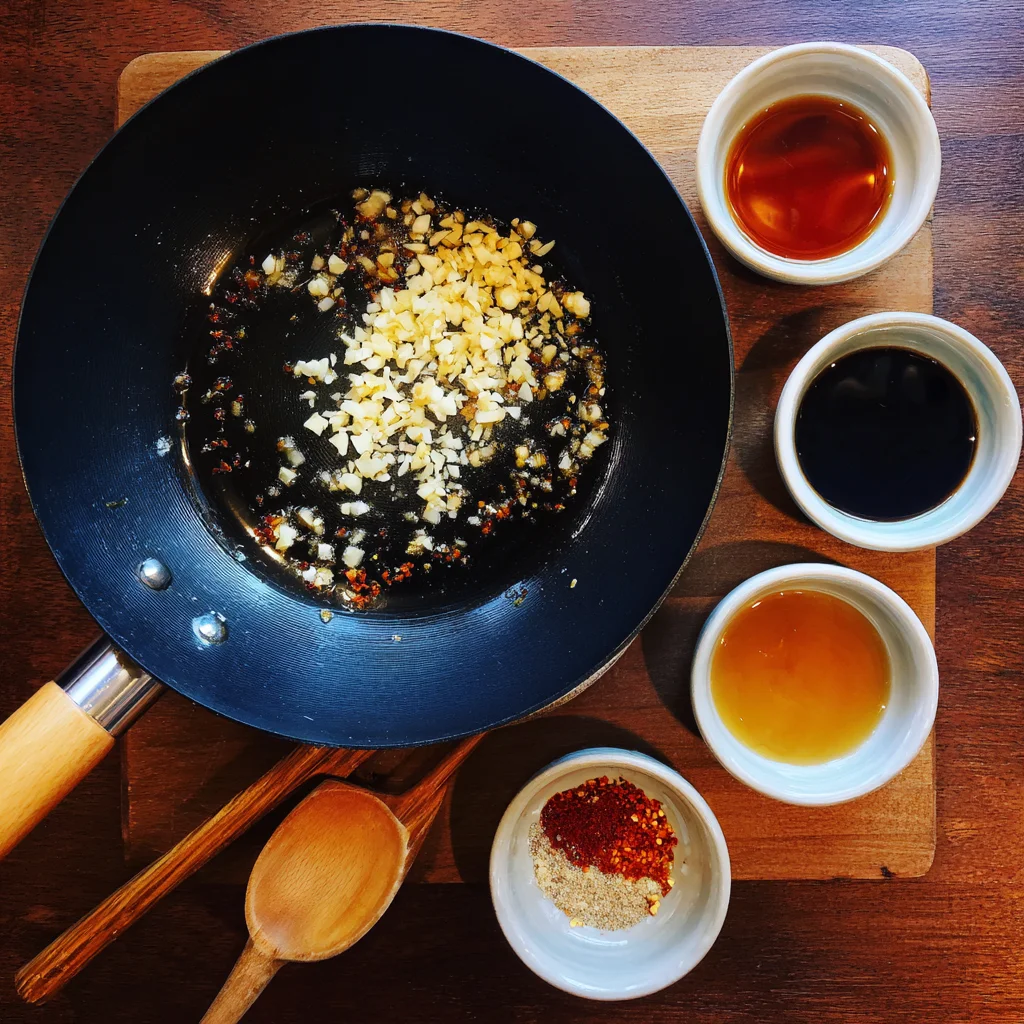 Now that your garlic is perfectly golden and fragrant, it’s time to pour in the sauce ingredients. In a small bowl or measuring cup, whisk together: