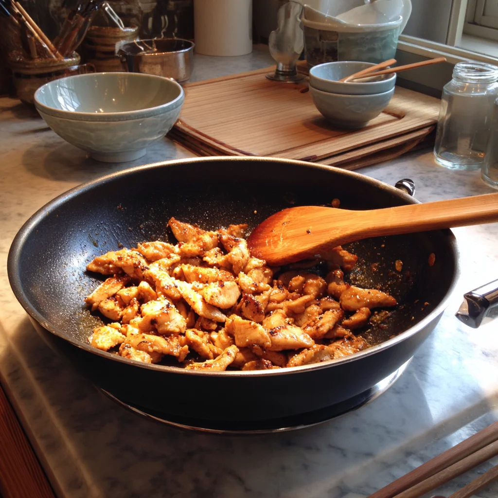 Grab your favorite skillet or wok (nonstick or cast iron works great here), and heat 1 tablespoon of oil over medium-high heat. Once the oil is hot, add the chicken and let it cook for about 5–6 minutes, stirring occasionally. You’re looking for golden edges and fully cooked pieces.