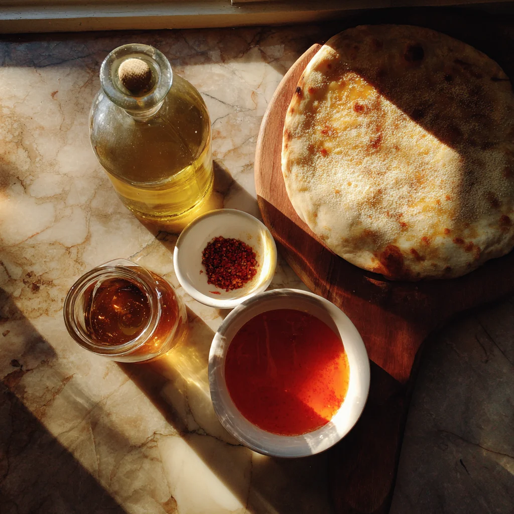You can buy hot honey at most grocery stores or make your own by gently warming ¼ cup of honey with ½ tsp of red pepper flakes. Let it sit for 10–15 minutes to infuse. Strain if you want a smoother finish, or leave the flakes in for extra kick.