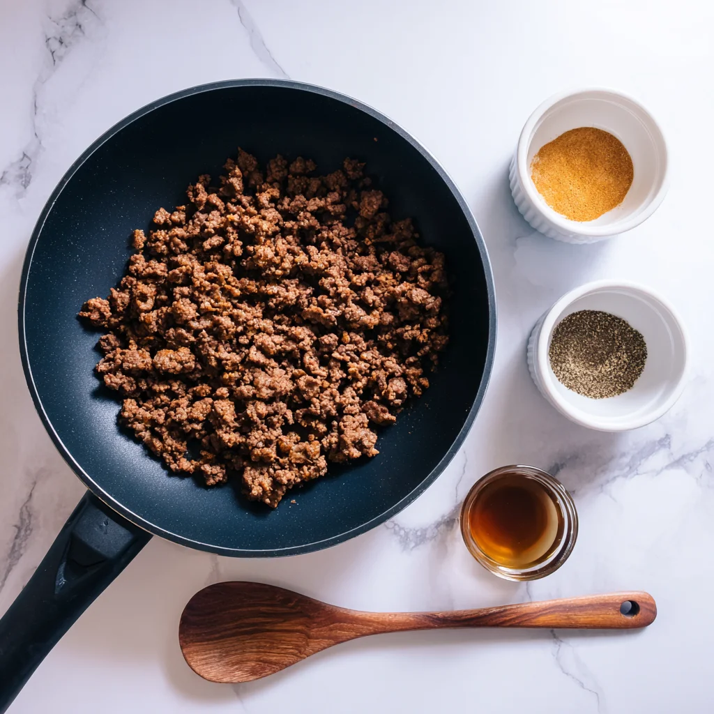 2 In a skillet over medium heat, cook the ground beef until browned and fully cooked. Drain excess grease. Add taco seasoning and ranch seasoning along with a splash of water and stir until combined. Simmer for a few minutes until the flavors are absorbed.