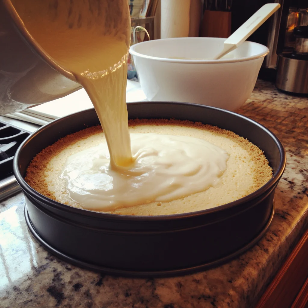 Once your crust has cooled and your filling is ready, go ahead and pour the filling into the prepared crust. Give the springform pan a few gentle taps on the counter—this helps release any air bubbles hiding in the batter. You want the surface nice and even.